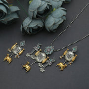 A Silver Dual Tone Monalisa Stone pendent and earrings set is a stunning and sophisticated jewelry combination that effortlessly blends timeless elegance with a modern twist.