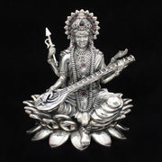 The silver Saraswati Mata Murti is a beautifully crafted idol representing Goddess Saraswati, the deity of knowledge, wisdom, music, and the arts. Made from high-quality silver, this elegant statue captures the goddess in a serene and graceful posture, often depicted sitting on a swan or lotus, with her veena (musical instrument) in hand. Her calm and composed expression symbolizes purity and intellect.