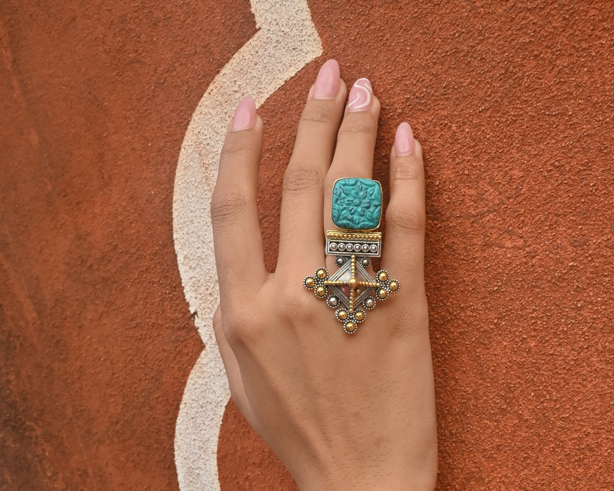 Light as a feather, bold in spirit — the silver fusion terquoise ring is a charming symbol of freedom, grace, and new beginnings. Crafted in 925 sterling silver and accented with a soft golden tone, this ring features a delicate bird in mid-flight, capturing the essence of motion and possibility.