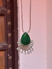 This silver oxidised pendant is a true statement of artistic craftsmanship and ethnic charm. Showcasing a beautifully carved green stone with floral motifs, it is framed by a radiant silver oxidised sunburst design and finished with delicate pearl danglers. The intricate detailing and antique oxidised finish give this silver oxidised pendant a timeless appeal, making it perfect for festive outfits, bohemian looks, or traditional wear. Whether worn solo or paired with other oxidised jewellery, this silver oxidised pendant adds a graceful touch to your neckline and elevates your overall ensemble.