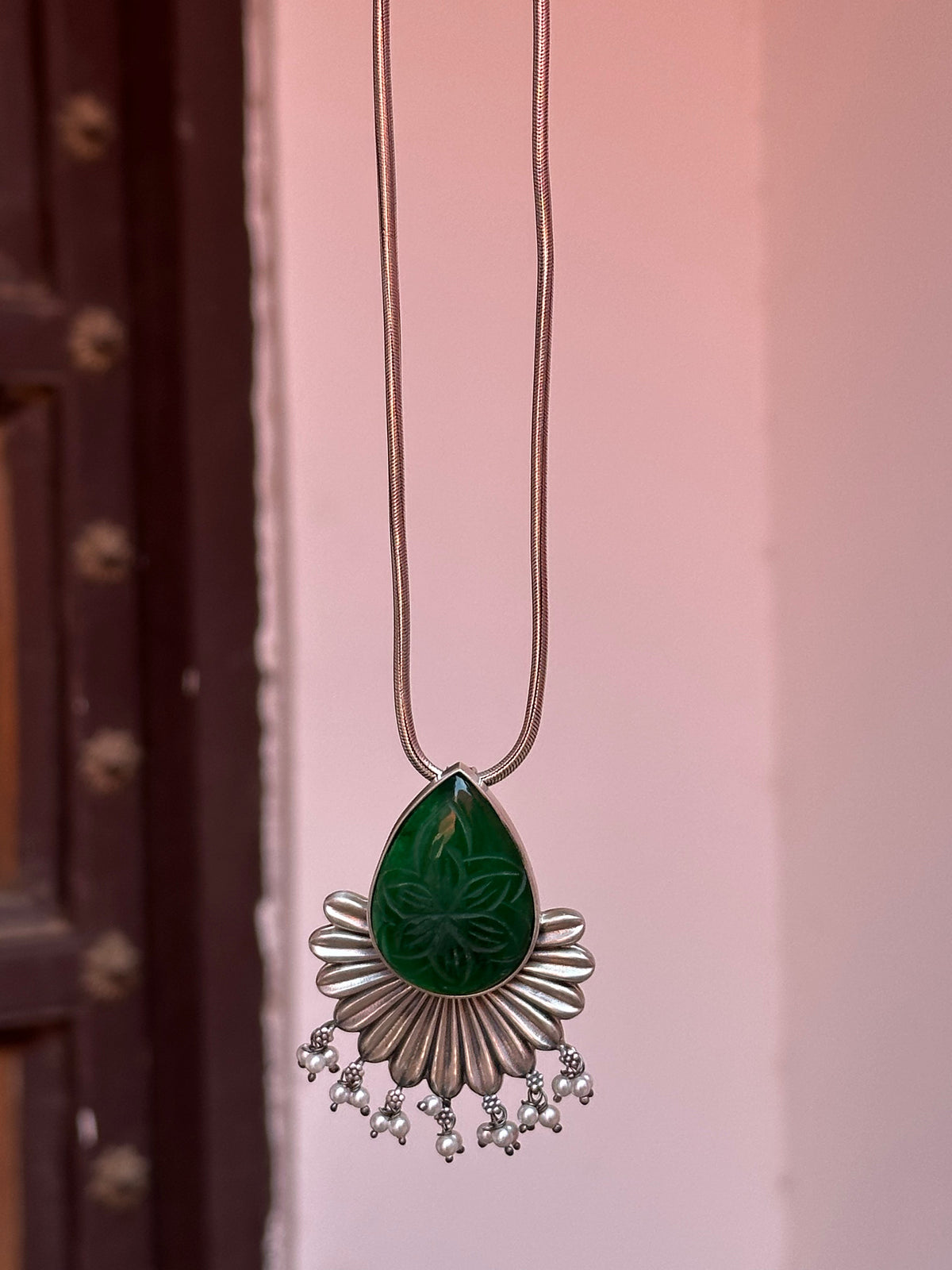 Elegant silver pendant featuring a carved green stone with floral motifs and delicate pearl drops.