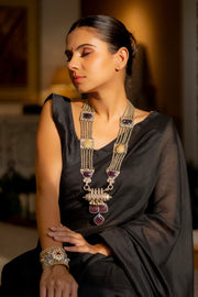 Celebrate the art of storytelling through adornment with this striking Rager Fusion Silver Jewellery set, an eclectic blend of tribal influences, temple aesthetics, and bohemian flair. This handcrafted jewellery trio includes a statement necklace, and dramatic earrings. Intricate charms, deity figures, miniature bells, birds, and floral elements come together in a dazzling composition accented by colorful gemstones, pearls, and oxidized silver finishes. Price includes for both necklace and earrings.