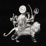 The fine detailing in her facial features, attire, and weapons showcases exceptional craftsmanship and reverence for the goddess. The shimmering silver finish enhances the divine aura of the statue, making it a timeless piece for worship or as a decorative centerpiece.