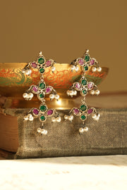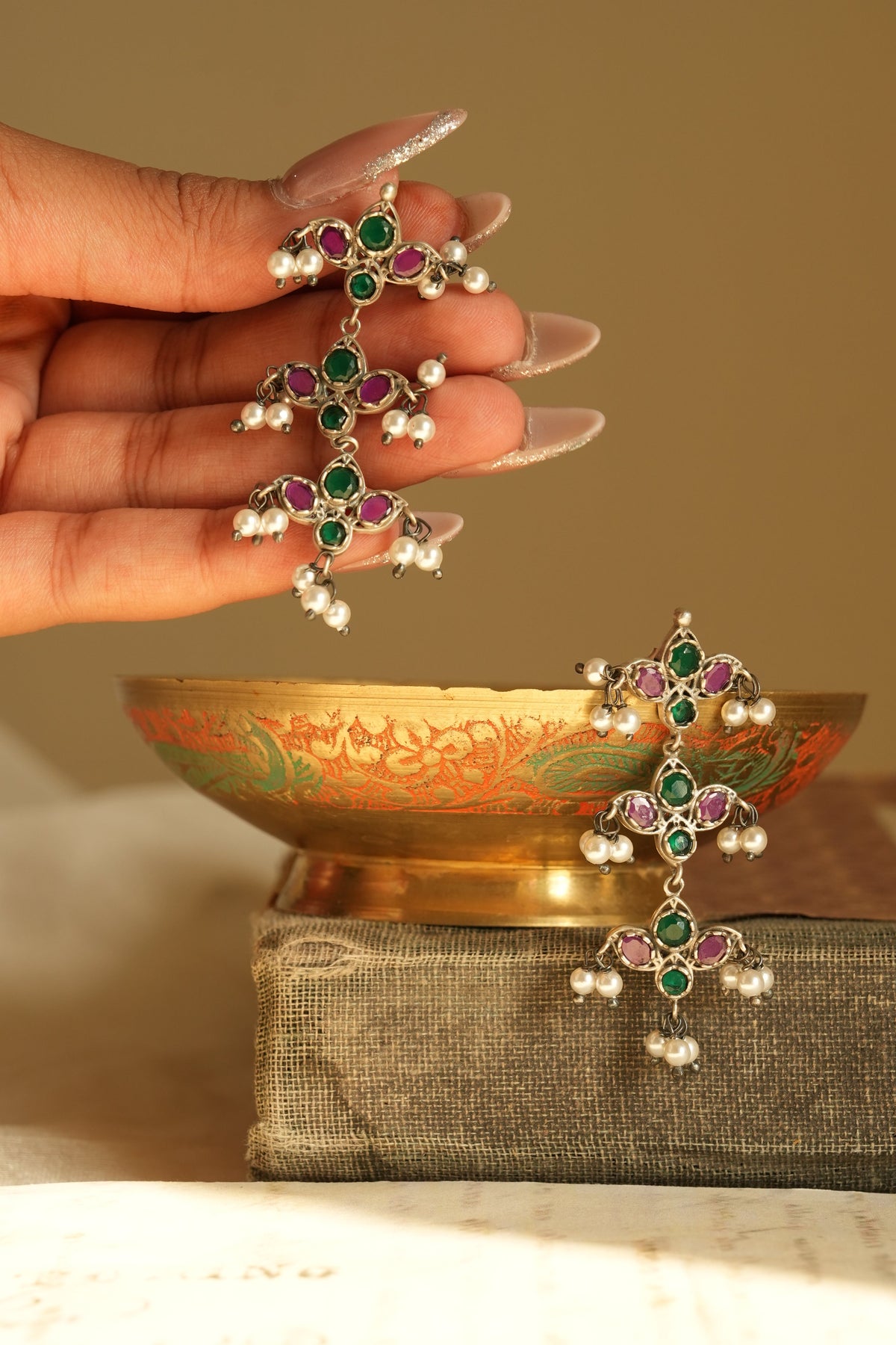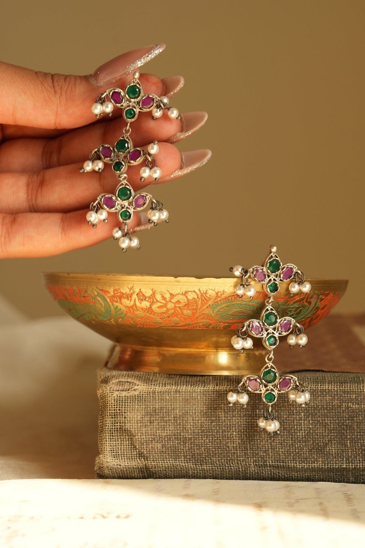 These stunning oxidised silver earrings are designed with a modern geometric silhouette blended with traditional Indian craftsmanship. The square green stone at the top, paired with rectangular magenta detailing, creates a bold yet graceful contrast. Dangling pearl clusters enhance their festive appeal. Perfect for both traditional and fusion outfits, these oxidised silver earrings are a timeless addition to your jewellery box. Whether it’s a casual day out or a festive celebration, these oxidised silver earrings will effortlessly elevate your style.