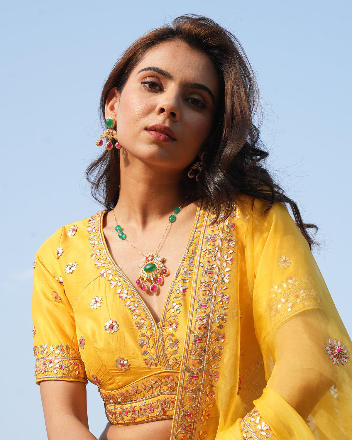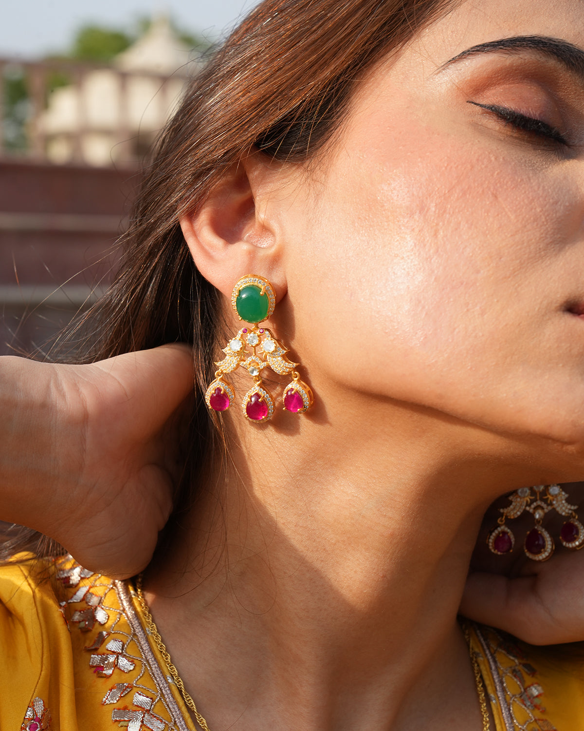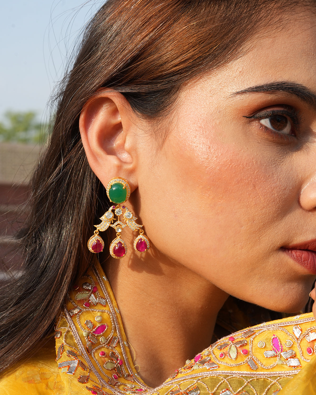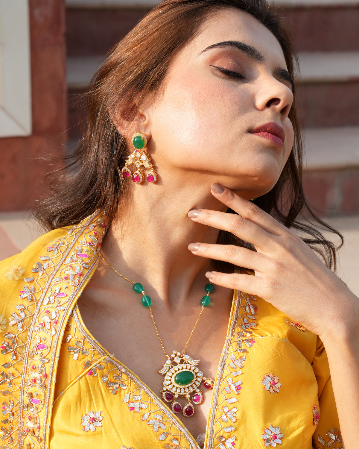 The pendant's symmetrical and graceful design showcases a perfect balance of color and artistry—drawing inspiration from royal Indian Jewellery.