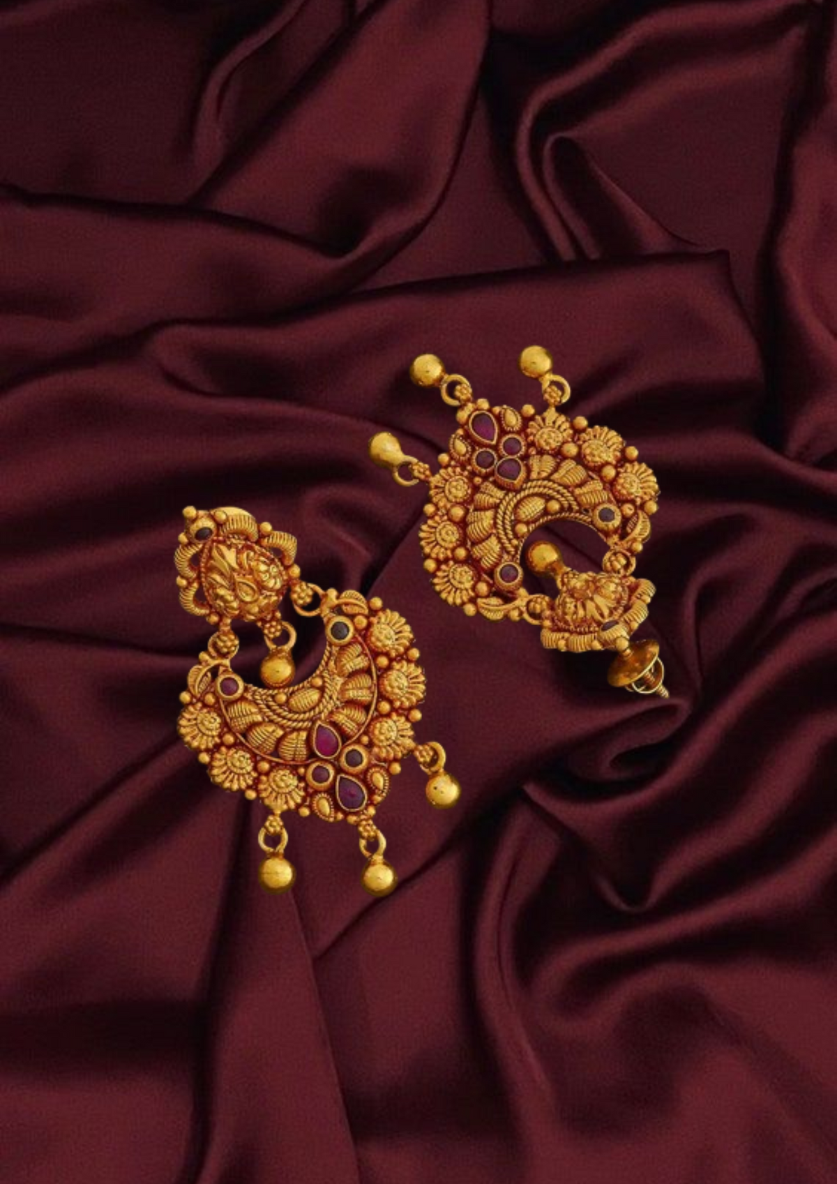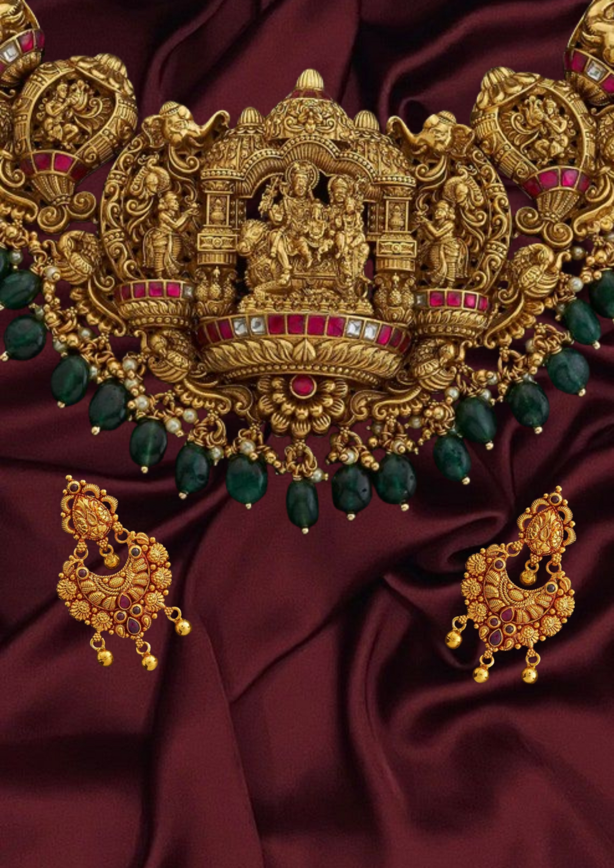Crafted with divine intricacy, this royalsilver temple necklaceshowcases a breathtaking vimana (temple tower) design centered around Goddess Lakshmi, seated with celestial charm and surrounded by finely sculpted deities. Accentuated with ruby-hued stonework and bordered with deep green emerald droplet hangings, thissilver temple necklaceexudes both spiritual depth and regal opulence. Whether for a bridal ceremony or a traditional celebration, thissilver temple necklaceadds timeless elegance and cultural richness to any ensemble.