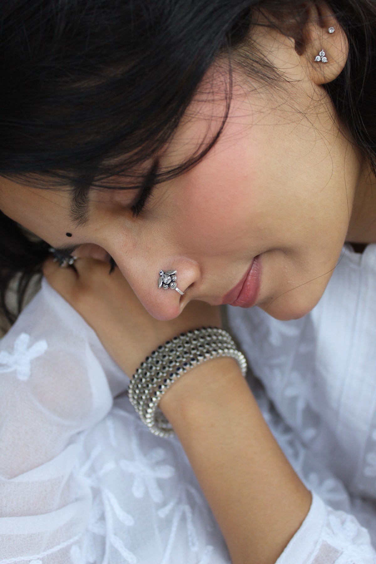 Elegant and timeless, this silver clearNose pin is a delicate piece of jewelry designed to add subtle sparkle to your everyday look. Handcrafted from 92.5 sterling silver, it features a brilliant white stone—resembling a diamond—for a clean, classic appearance. The high-polish finish enhances its shine, while the minimalist design ensures it pairs well with any outfit, from traditional to modern.