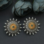 A Silver Dual Tone Pearl Bordered flower Studs is a beautifully crafted and sophisticated piece of jewelry that combines elegance with a touch of nature-inspired design.
