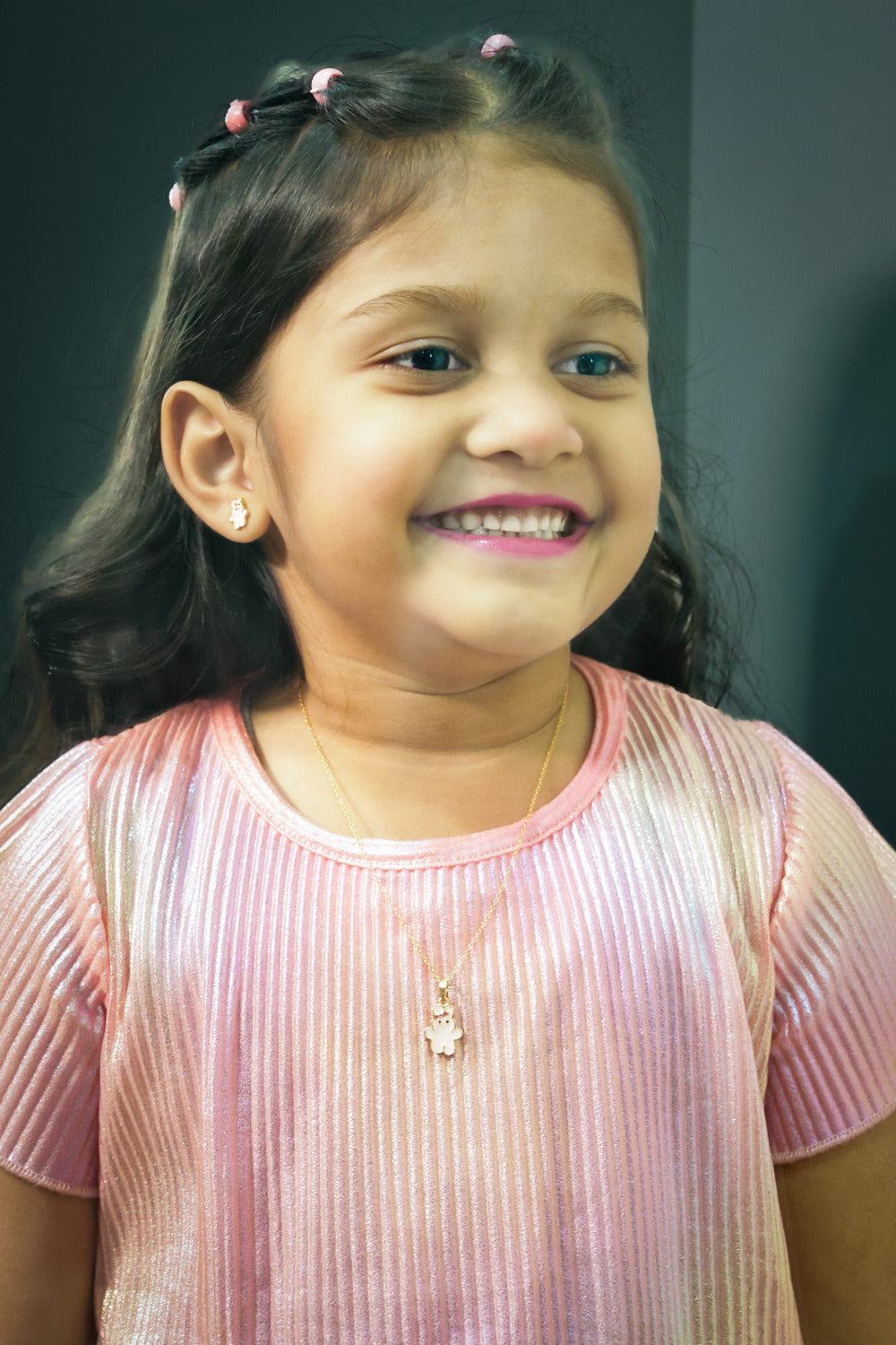 This delightful Silver teddy shaped pendent with Earrings Set for kids is the perfect accessory for little ones who love cute and fun designs! Crafted from high-quality sterling silver, the set features an adorable teddy bear motif with rounded, soft features. The pendant showcases a charming teddy bear face with a polished finish, making it shine beautifully as it hangs from a delicate silver chain. The matching earrings are sweet, small studs shaped like teddy bears, designed to sit comfortably and securely on young ears.