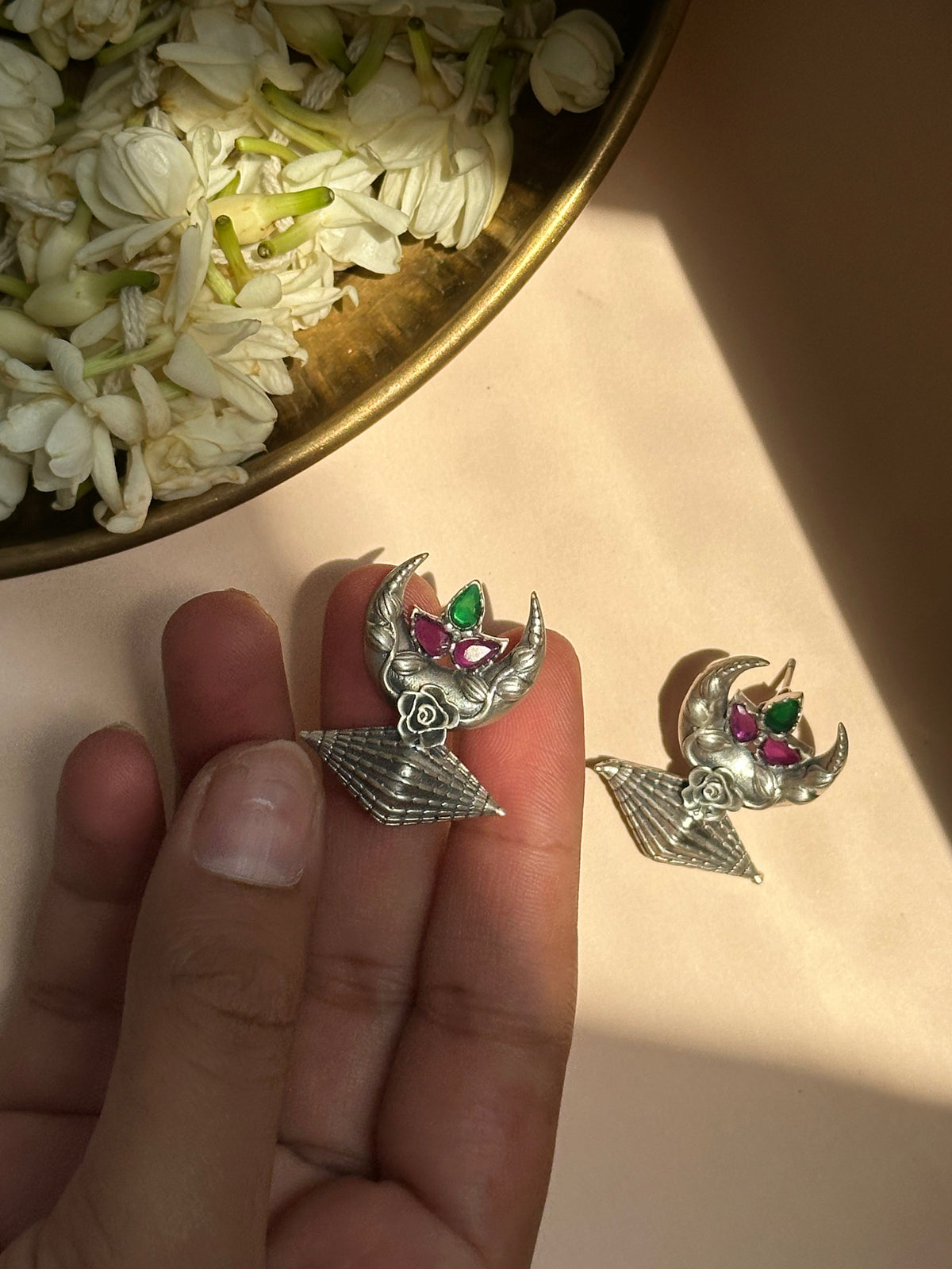 These crescent-shaped silver oxidised earrings beautifully blend traditional charm with contemporary aesthetics. Featuring a half-moon base adorned with delicate floral details and deep pink enamel accents, these earrings are an artistic expression of elegance and strength. The bottom diamond-shaped drop adds an edgy twist to the soft curves of the crescent. Whether paired with a cotton saree or an Indo-western outfit, these silver oxidised earrings are designed to turn heads. Lightweight and versatile, they add just the right amount of ethnic drama, making these silver oxidised earrings an essential in your jewellery box