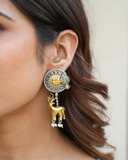 Striking dual-tone long earrings featuring a beautifully crafted deer motif. A blend of tradition and whimsy, perfect for festive styling or statement accessorizing.