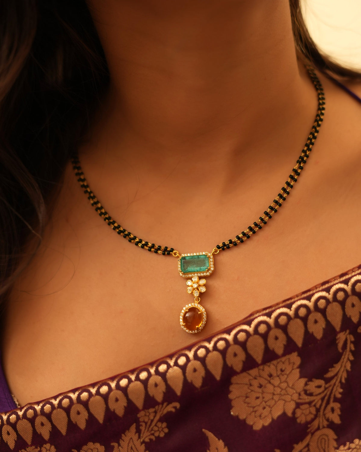 Celebrate love and tradition with thisexquisitely crafted emerald polki mangalsutra designed for the modern bride who cherishes timeless elegance. At the heart of this stunning piece is arich emerald stone, symbolizing love, prosperity, and peace, set in the classic Polki style for a radiant, regal look.The emerald is beautifully bordered withdelicate ruby accentsandsparkling diamond clusters, creating a frame that enhances its brilliance and adds a luxurious depth to the design. Theruby stonesadd warmth and richness, while thediamond clustersbring just the right amount of shimmer for a refined and elegant finish.