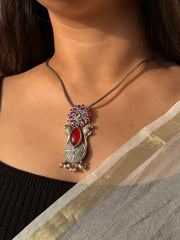 Grace your neckline with this beautifully detailed Silver oxidised pendent , featuring a bold red stone, filigree work, and delicate pearl accents—ideal for festive and traditional wear.