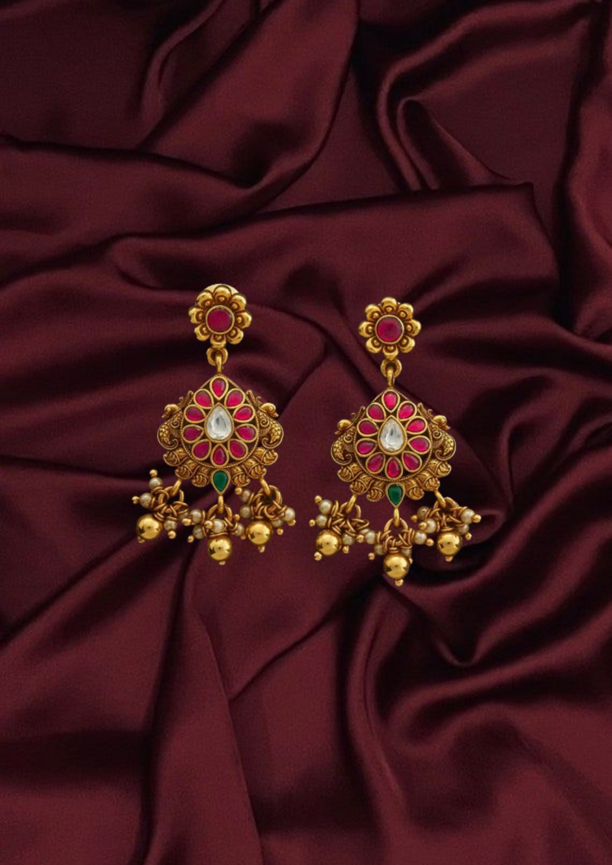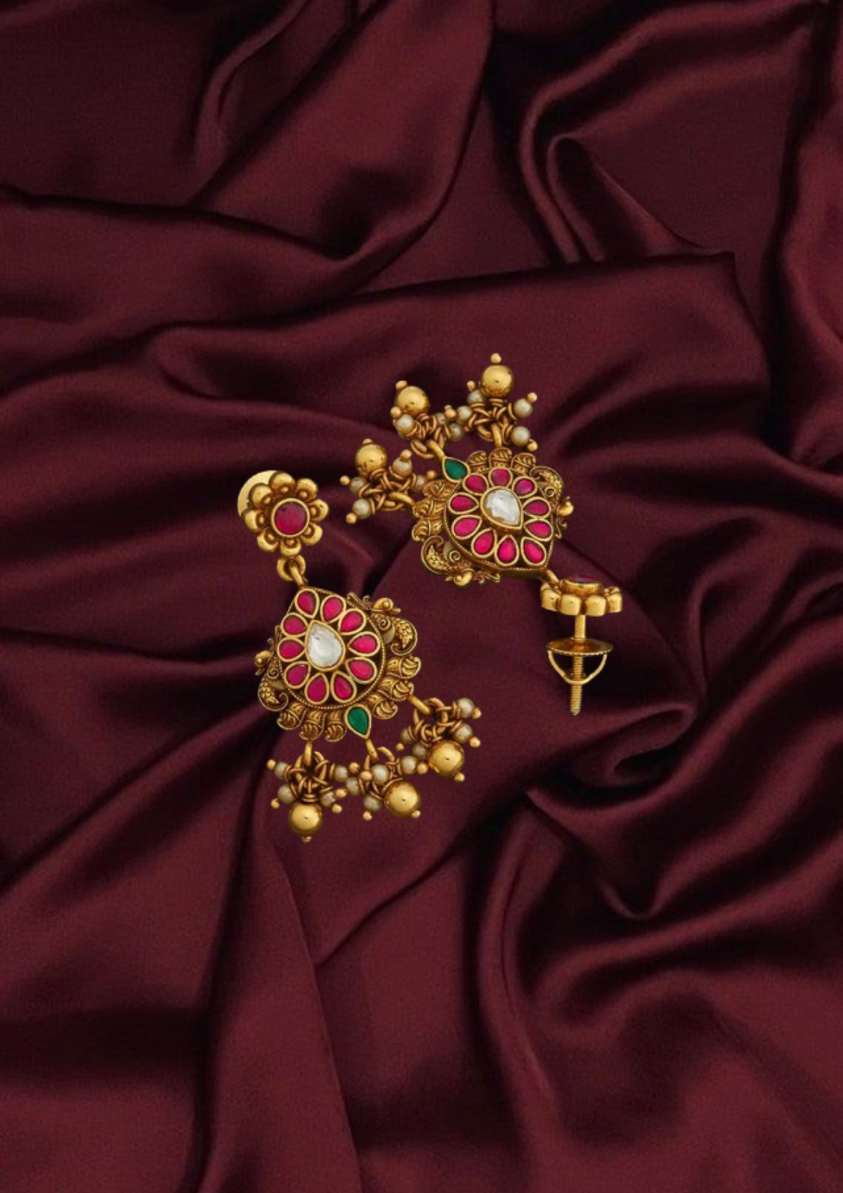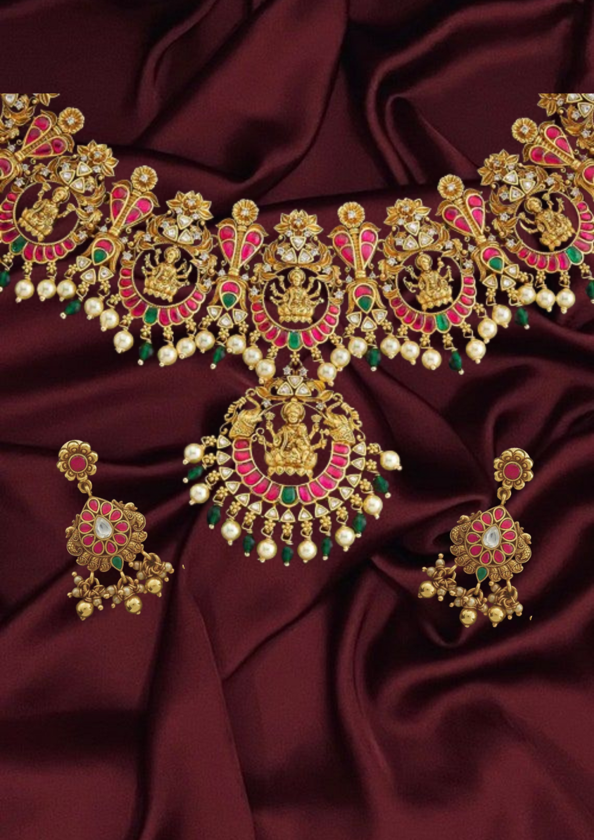 This handcraftedsilver temple necklaceis a stunning example of traditional Indian artistry, featuring divine goddess Lakshmi motifs framed in elaborate detailing. The necklace is enriched with vibrant red and green enamel, intricate floral patterns, and classic pearl danglings that add a touch of regal charm. Designed for the modern woman who cherishes heritage, this silver temple necklace blends devotion with style. Ideal for bridal wear or cultural festivities,thesilver temple necklaceserves as both a spiritual symbol and a luxurious fashion statement. Let thissilver temple necklaceelevate your ethnic wardrobe with timeless grace and sacred elegance.