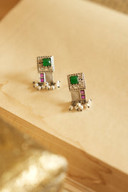 Add a touch of ethnic geometry to your look with these oxidised silver earrings featuring green and magenta stones.