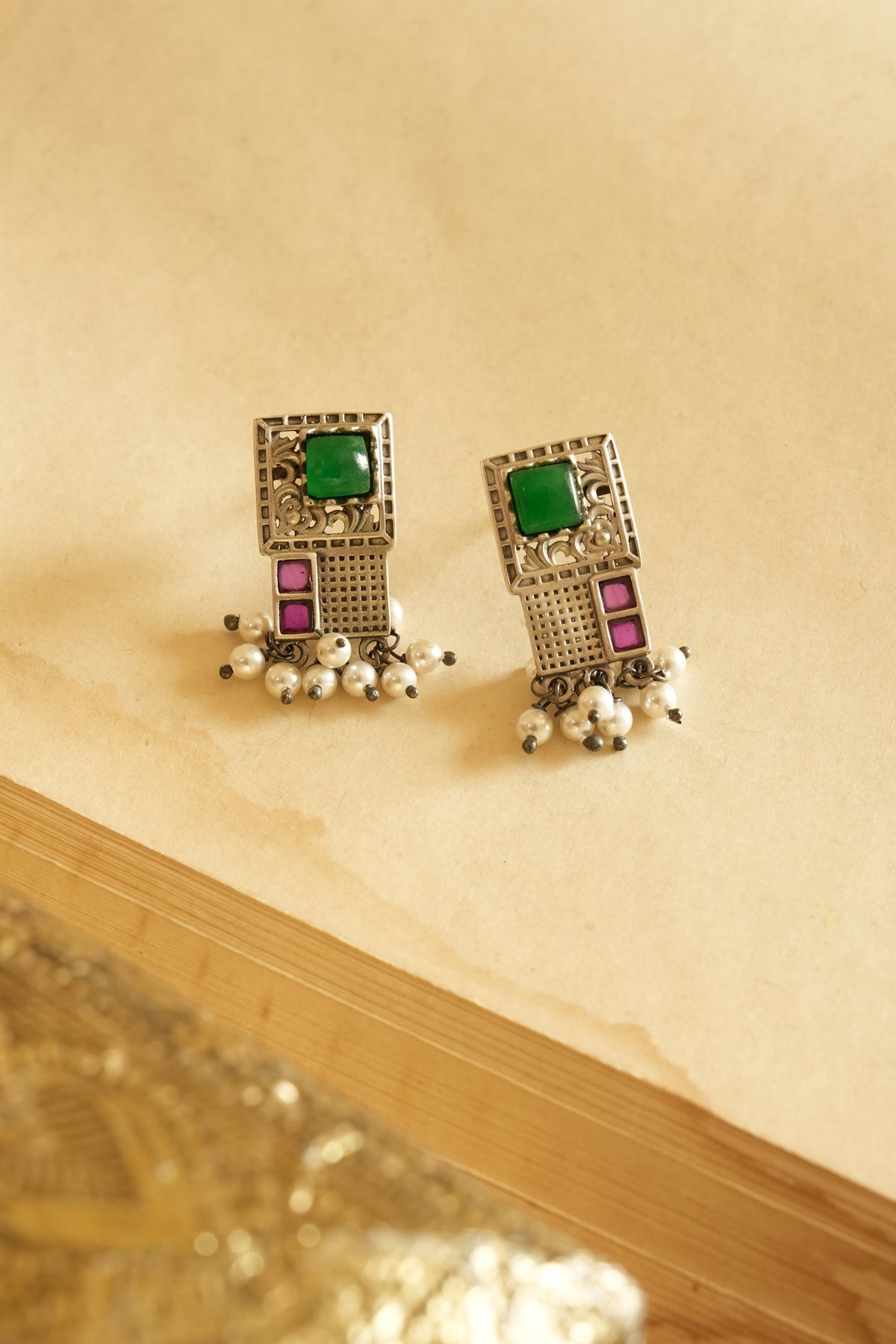 These stunning oxidised silver earrings are designed with a modern geometric silhouette blended with traditional Indian craftsmanship. The square green stone at the top, paired with rectangular magenta detailing, creates a bold yet graceful contrast. Dangling pearl clusters enhance their festive appeal. Perfect for both traditional and fusion outfits, these oxidised silver earrings are a timeless addition to your jewellery box. Whether it’s a casual day out or a festive celebration, these oxidised silver earrings will effortlessly elevate your style.