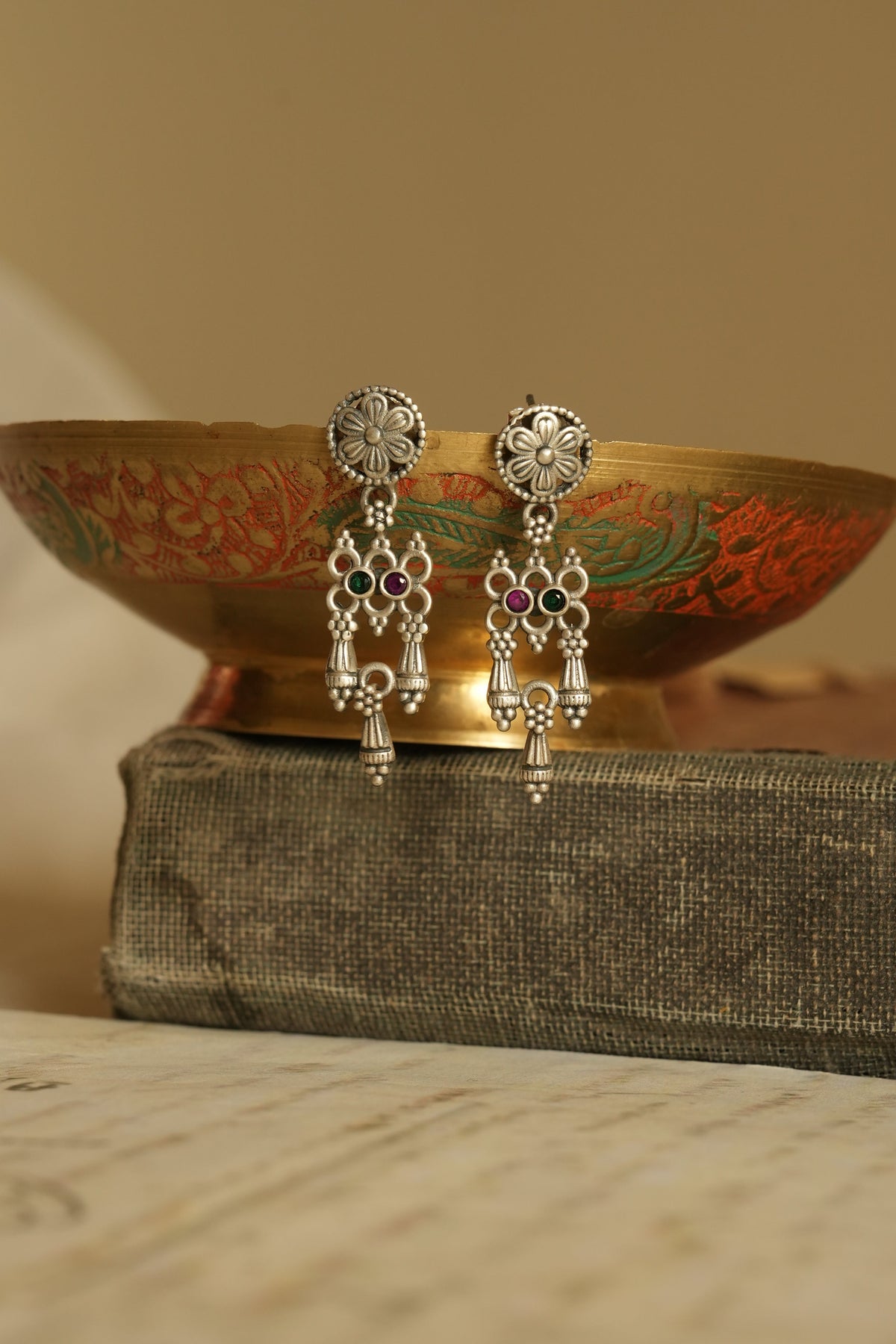 Add a touch of ethnic geometry to your look with these oxidised silver earrings featuring green and magenta stones.