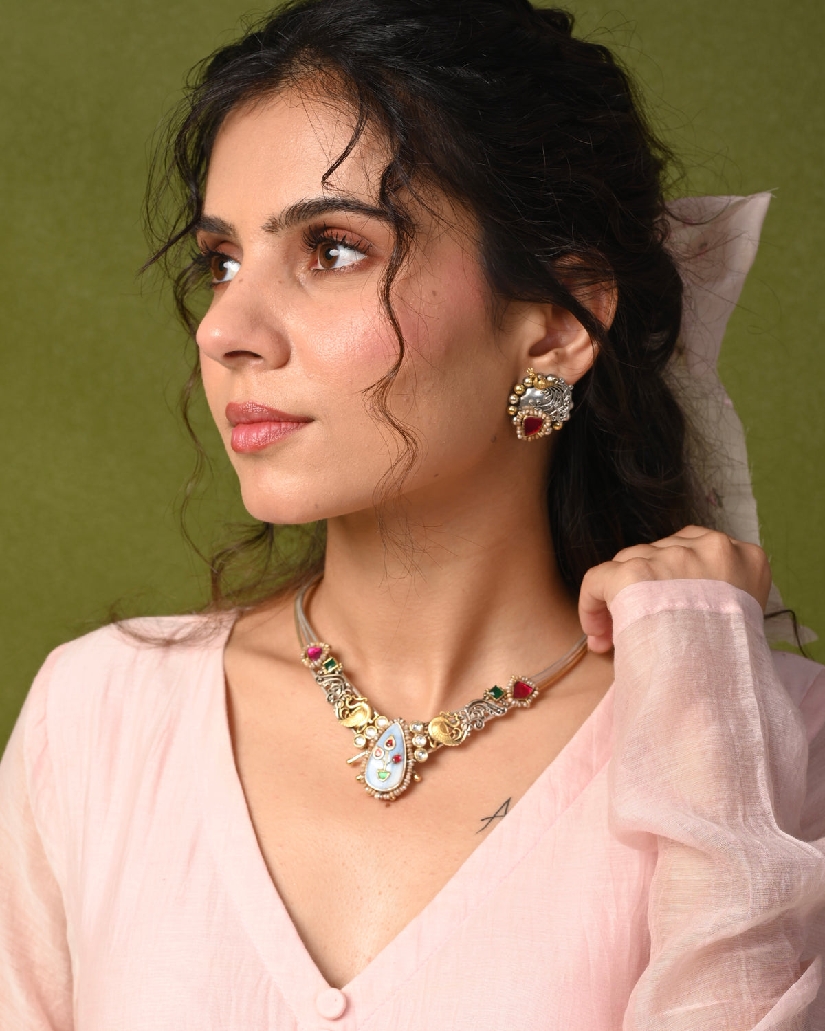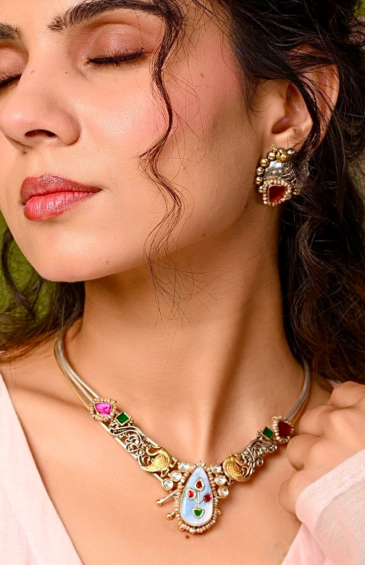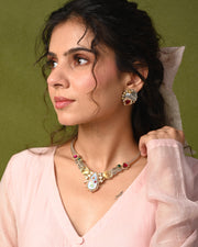 Paired with coordinated earrings that echo the same artistry, the set is perfectly balanced and visually striking.Lightweight and comfortable for extended wear, this choker set is ideal for pairing with sarees, kurtis, lehengas, or fusion outfits. Whether you’re dressing for a festive celebration or adding drama to your everyday ethnic wear, this piece adds just the right amount of statement and sophistication.