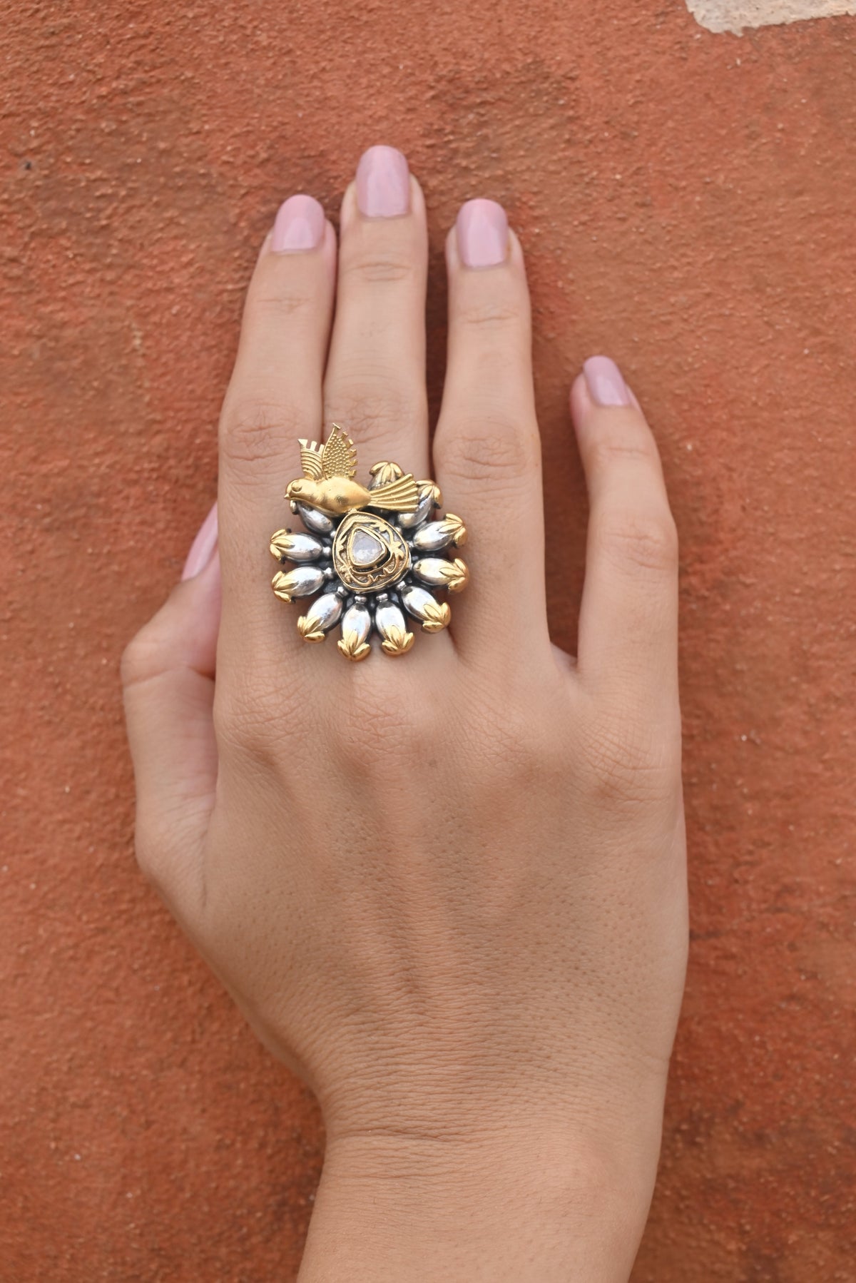 The dual-tone finish adds a unique contrast, blending cool silver with warm golden highlights to create a look that's both modern and timeless. With itsadjustable band, the Birdy Ring offers a comfortable and flexible fit, making it a perfect everyday accessory or a thoughtful gift.