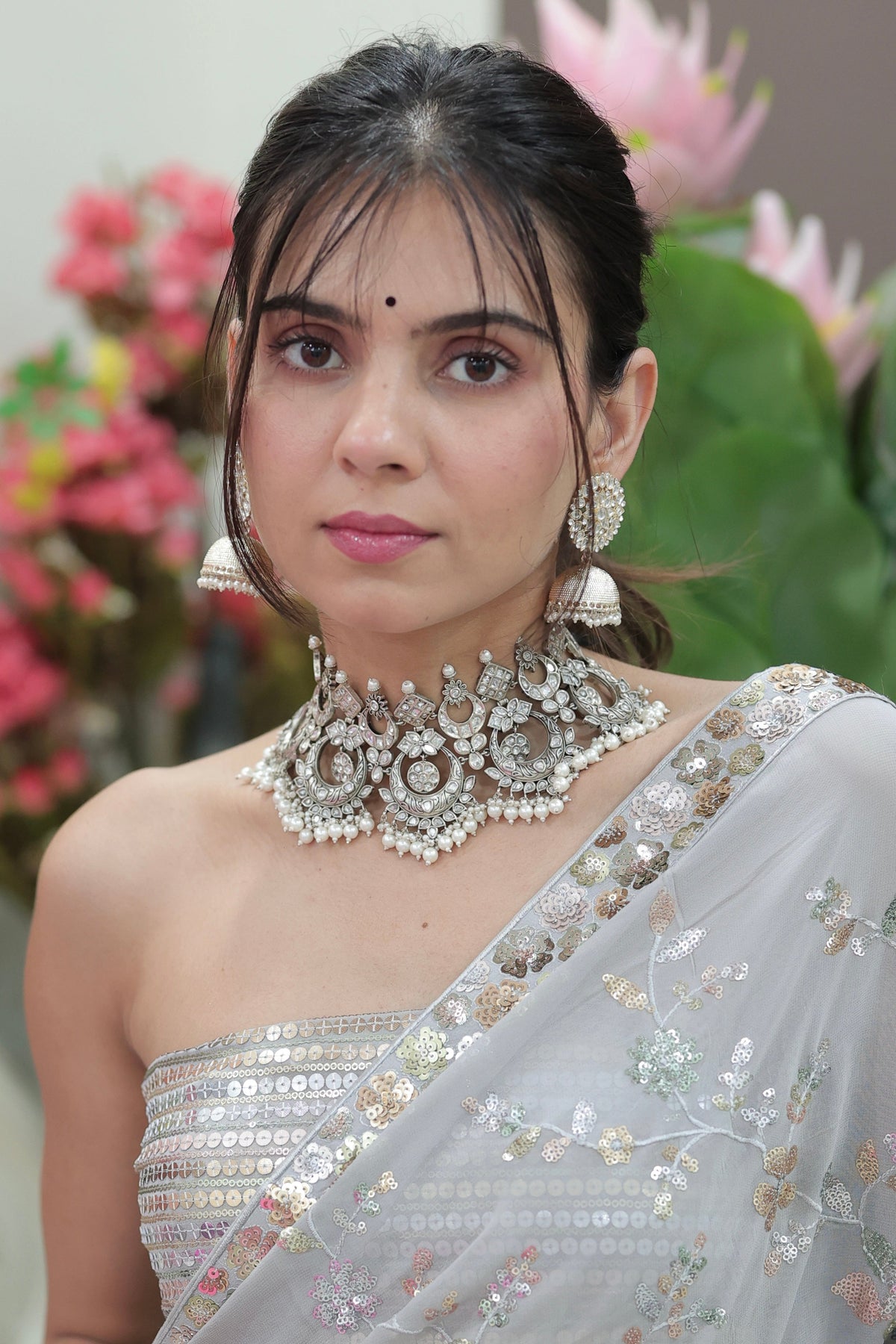 Grace your neckline with timeless elegance in this silver pearl oxidised necklace handcrafted from 92.5 sterling silver. Featuring a beautiful fusion of oxidized silver detailing and delicate white pearls, this necklace reflects traditional charm with a contemporary twist.